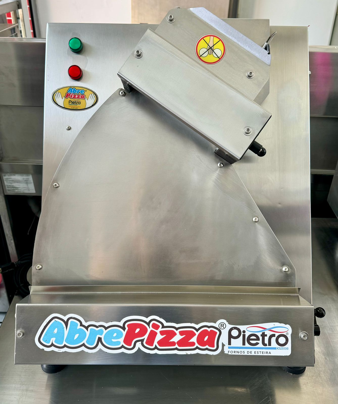 Modelo AP 460 II – Abre Pizza. Ideal para estender massas, fácil de operar, não requer mão de obra especializada, aumenta muito a produtividade/hora, abre massas até o formato 45 cm. Atende as exigências da normas de segurança do trabalho NR-12**.